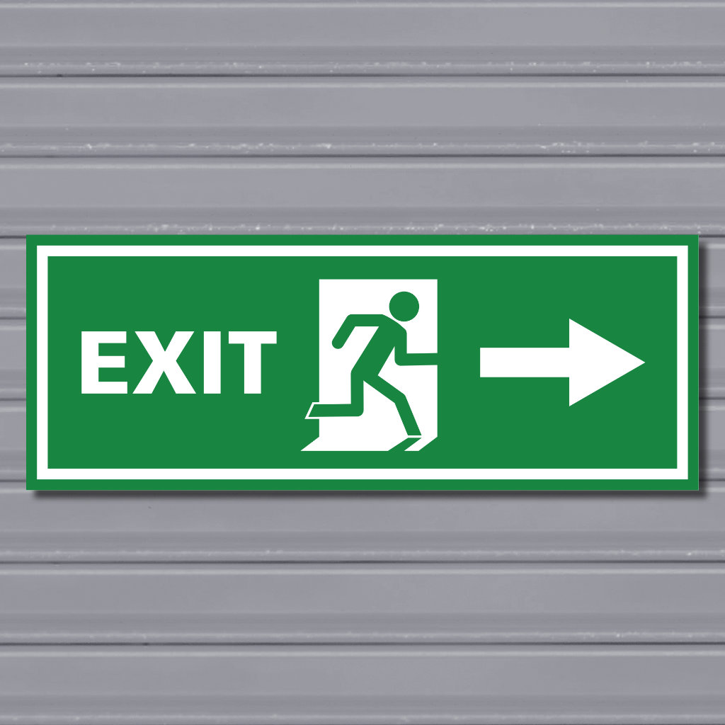 This landscape emergency exit sign measures 30×11.4cm and clearly displays the word “EXIT” alongside the universally recognised running man symbol and a right-pointing directional arrow, indicating a right-hand escape route. Designed in high-visibility green, it ensures immediate recognition and clear guidance during emergency situations.