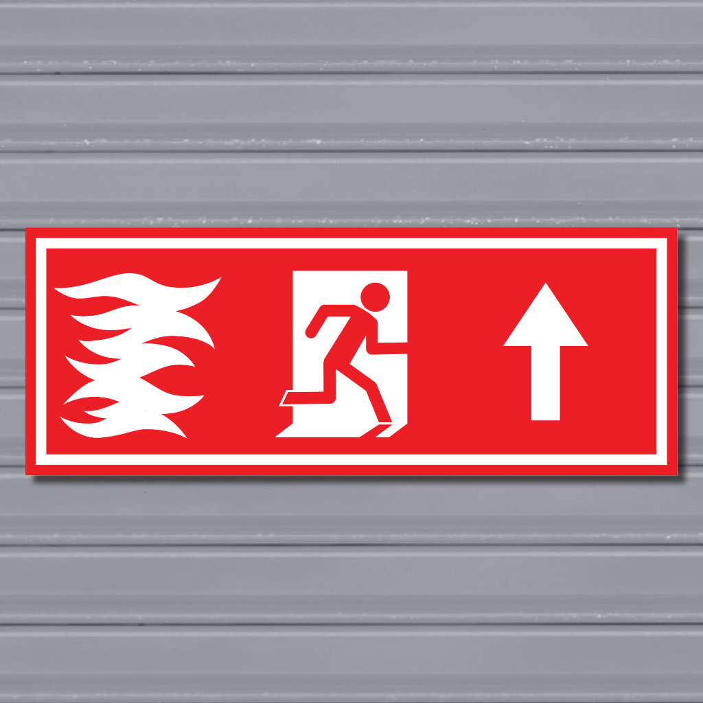 This landscape emergency fire exit sign measures 30×11.4cm and clearly indicates a right-hand, forward evacuation route using the universally recognised running man, Fire 1 flame symbol, and upward directional arrow. The extended layout provides clear visual sequencing, helping occupants instinctively follow the correct escape path during emergencies.