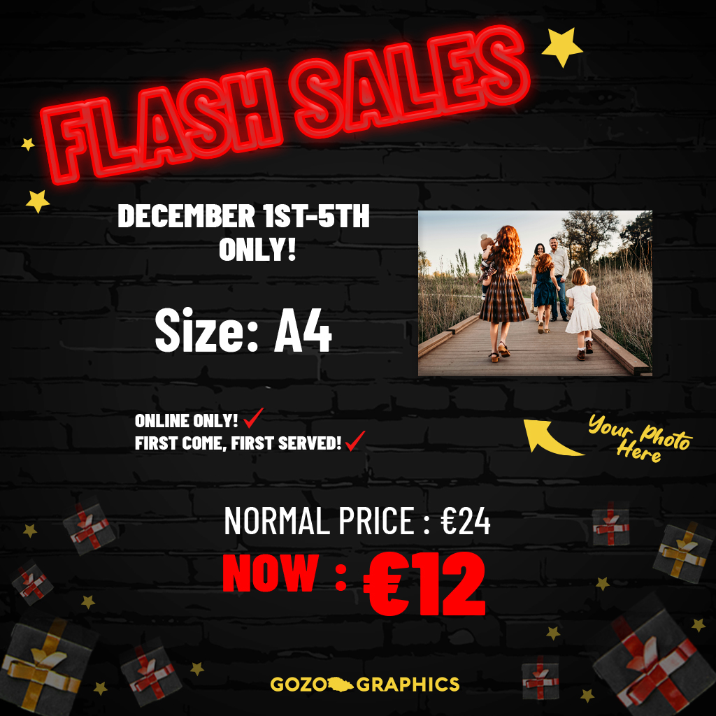 This **A4 Black November Flash Deal** is **exclusive to our website** and available **from 1st to 5th December 2025 (Malta time)**. Secure your **premium Malta-made canvas print** at this incredible price — **upload your image now** and be part of **Black November Fest**, Malta’s most trusted **Black Friday canvas sale**.