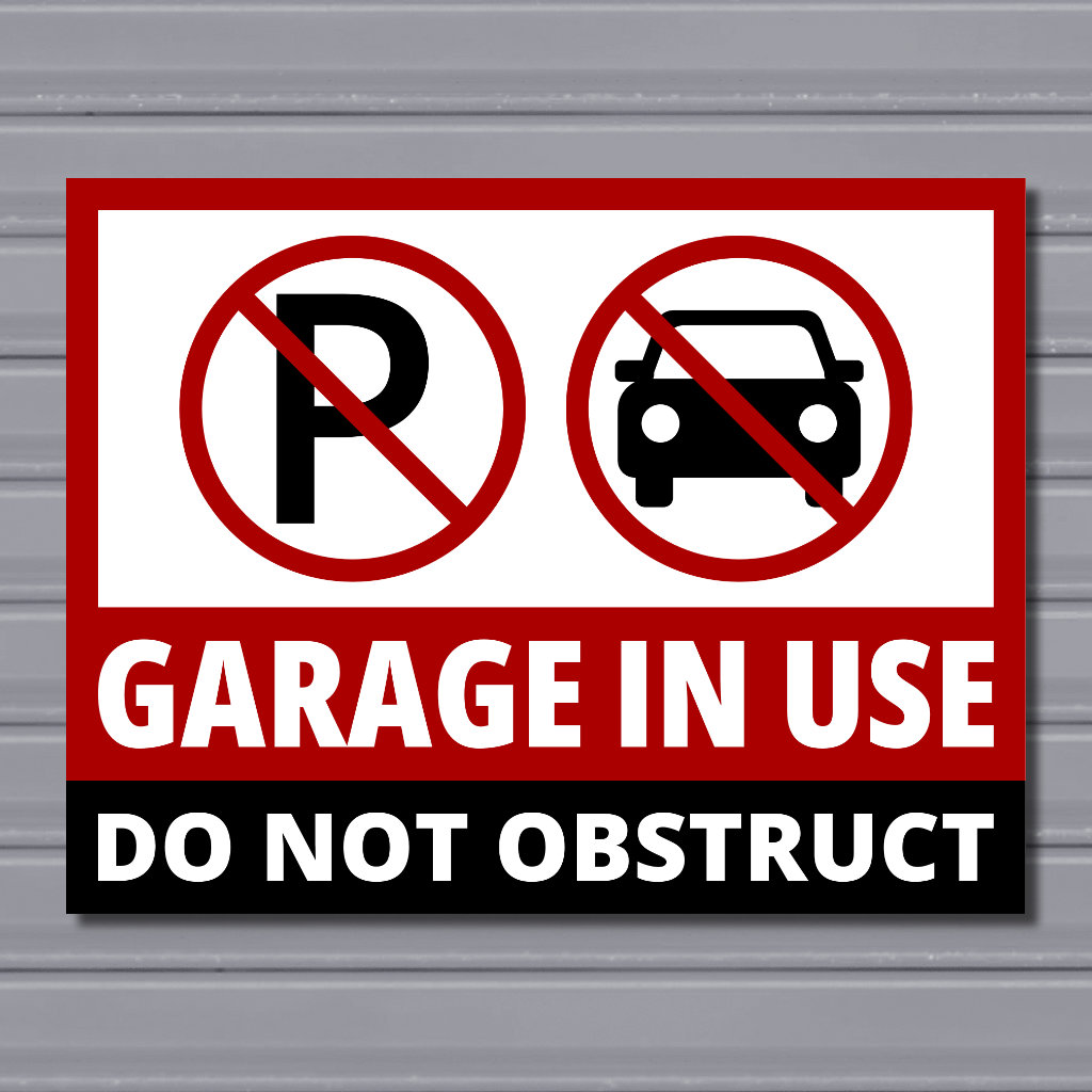 This landscape safety sign, measuring 30x23cm, uses a high-contrast layout to communicate that the garage is in use and must not be obstructed. Prohibition icons improve immediate recognition.