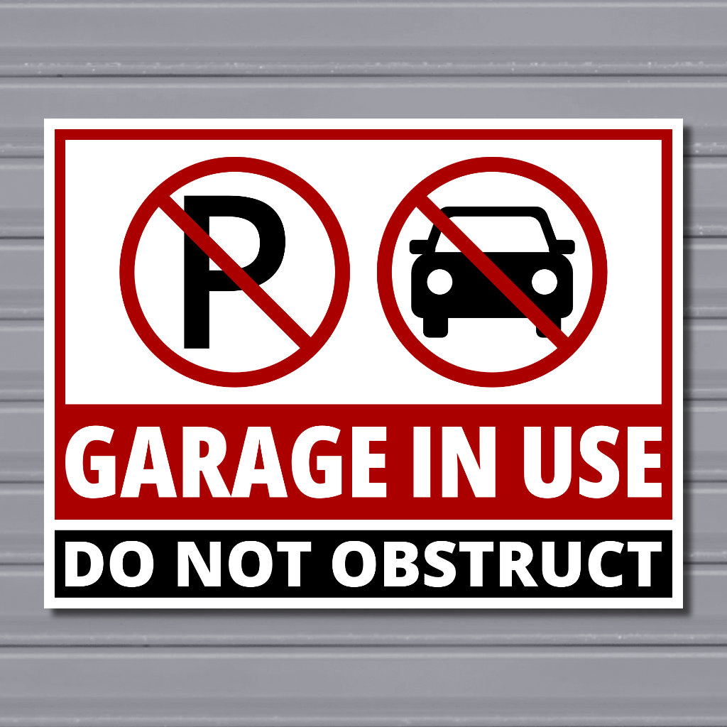This landscape safety sign, measuring 30x23cm, clearly indicates that the garage is in use and must not be obstructed. Dual prohibition symbols reinforce the message for both parking and vehicle access.
