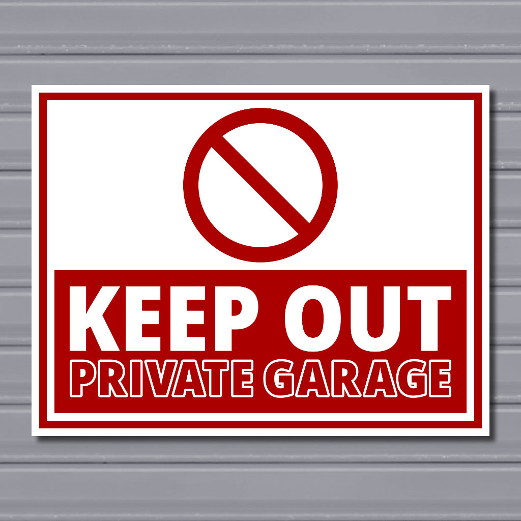 This landscape Keep Out safety sign, measuring 30x23cm, features a universal prohibition symbol with outlined “Private Garage” text for a clean yet authoritative appearance. The red and white colour scheme ensures immediate recognition and clear communication.