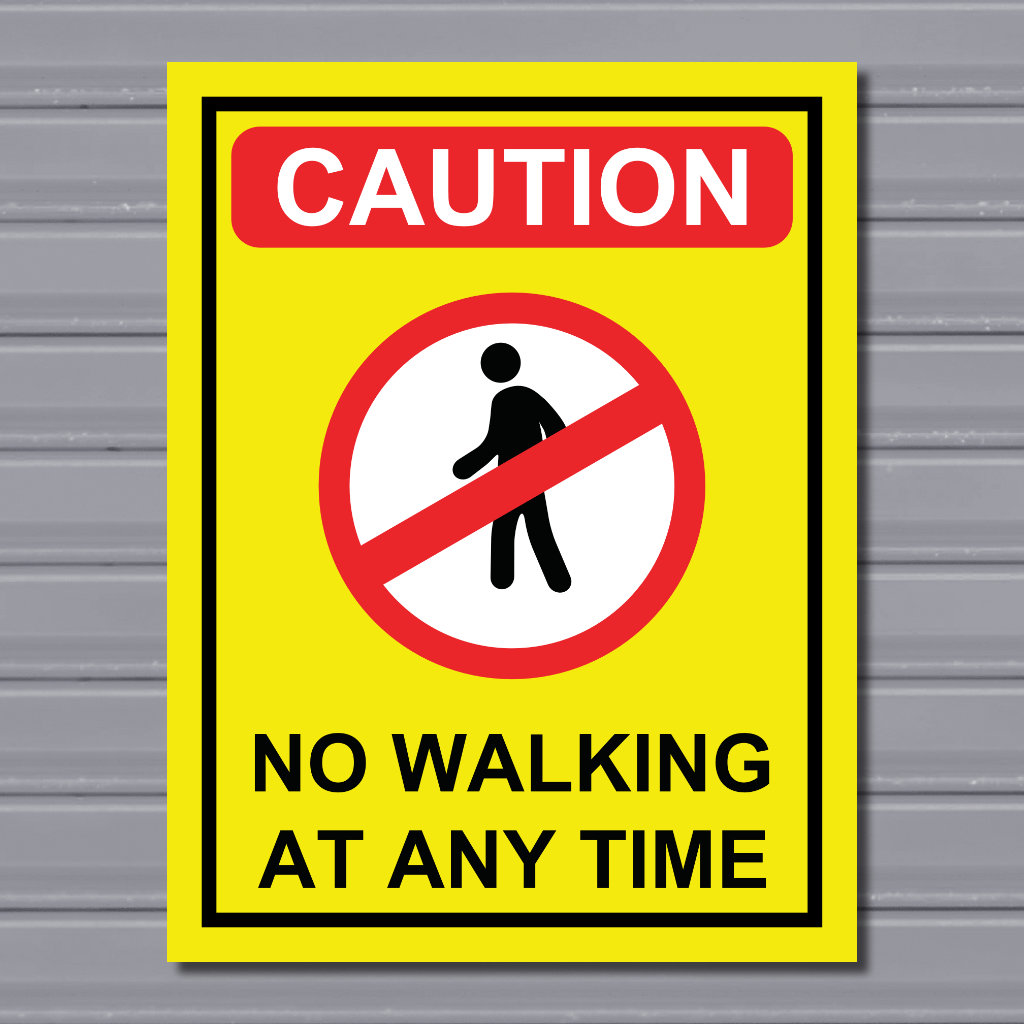 This portrait caution safety sign measures 23x30cm and clearly warns that walking is strictly prohibited at all times. Featuring a high-visibility yellow background, a bold “CAUTION” header, and a universally recognised no-walking symbol, it delivers an immediate visual warning in areas where pedestrian access poses a safety risk.