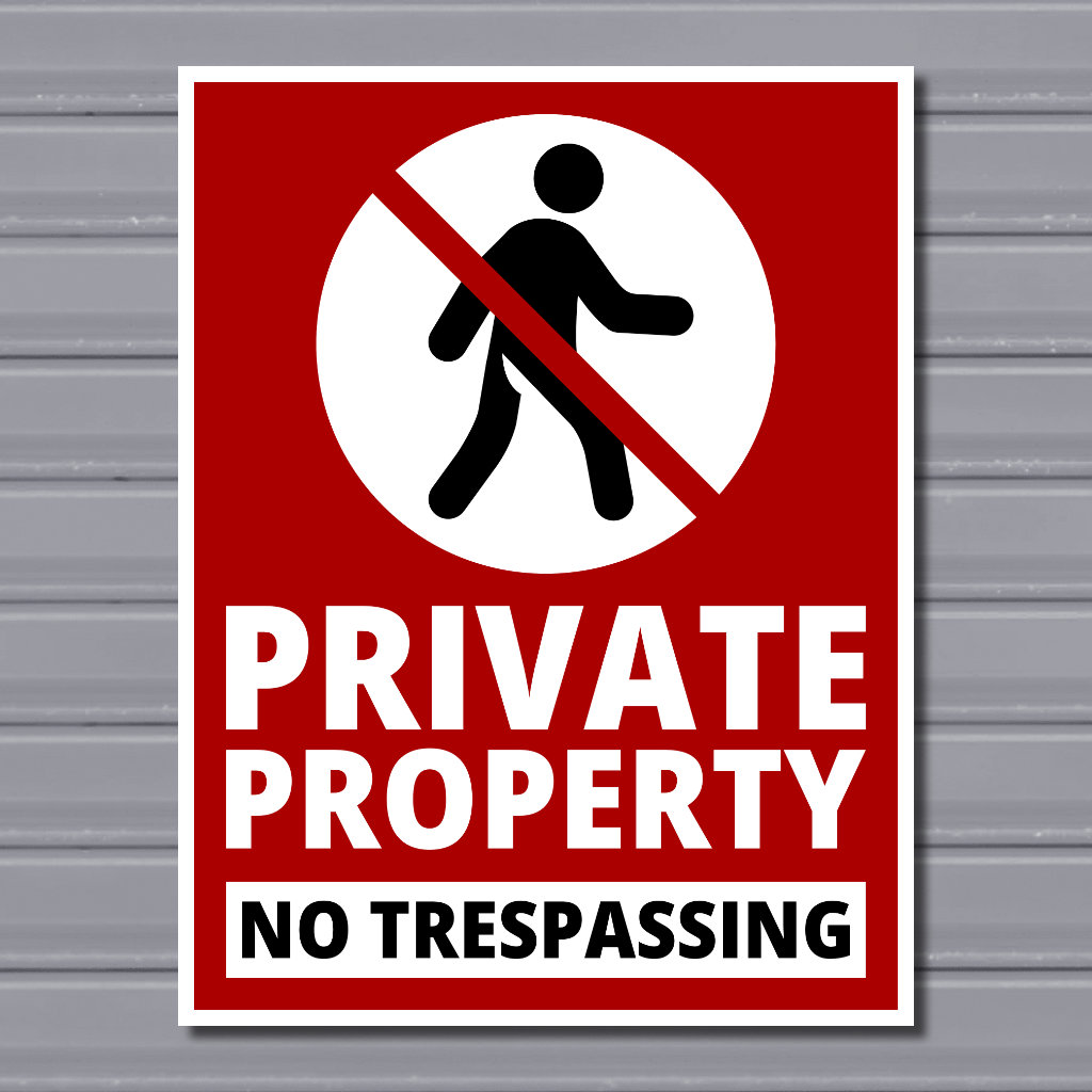 This portrait private property safety sign, measuring 23x30cm, combines a walking person icon with a no trespassing symbol to clearly prohibit unauthorised entry. The bold design ensures the message is immediately recognised and taken seriously.