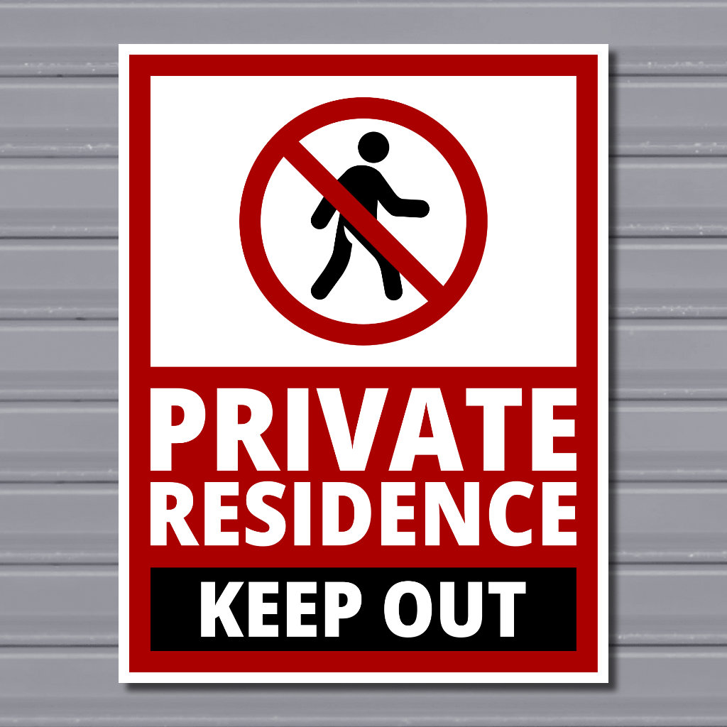 This portrait prohibition sign, measuring 23x30cm, communicates “Private Residence – Keep Out” using a bold layout with reduced white space for stronger visual impact. The clear iconography ensures the message is seen instantly.