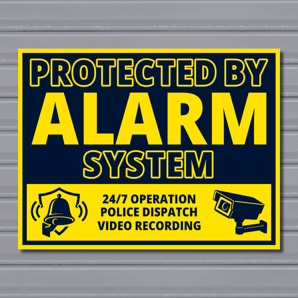 This landscape alarm system sign, measuring 30x23cm, combines dark blue and yellow to balance professionalism with high visibility. It clearly states 24/7 operation, police dispatch, and video recording.