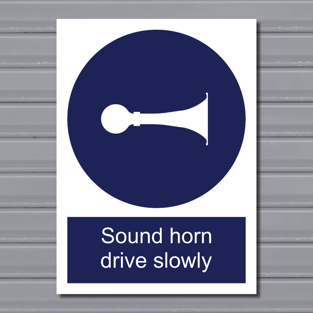 This portrait vehicle safety sign measures 21.8x30cm and clearly displays the instruction “Sound horn drive slowly.” Using a bold, universally recognised horn symbol, it provides immediate visual guidance to drivers operating in areas with limited visibility or increased pedestrian activity.