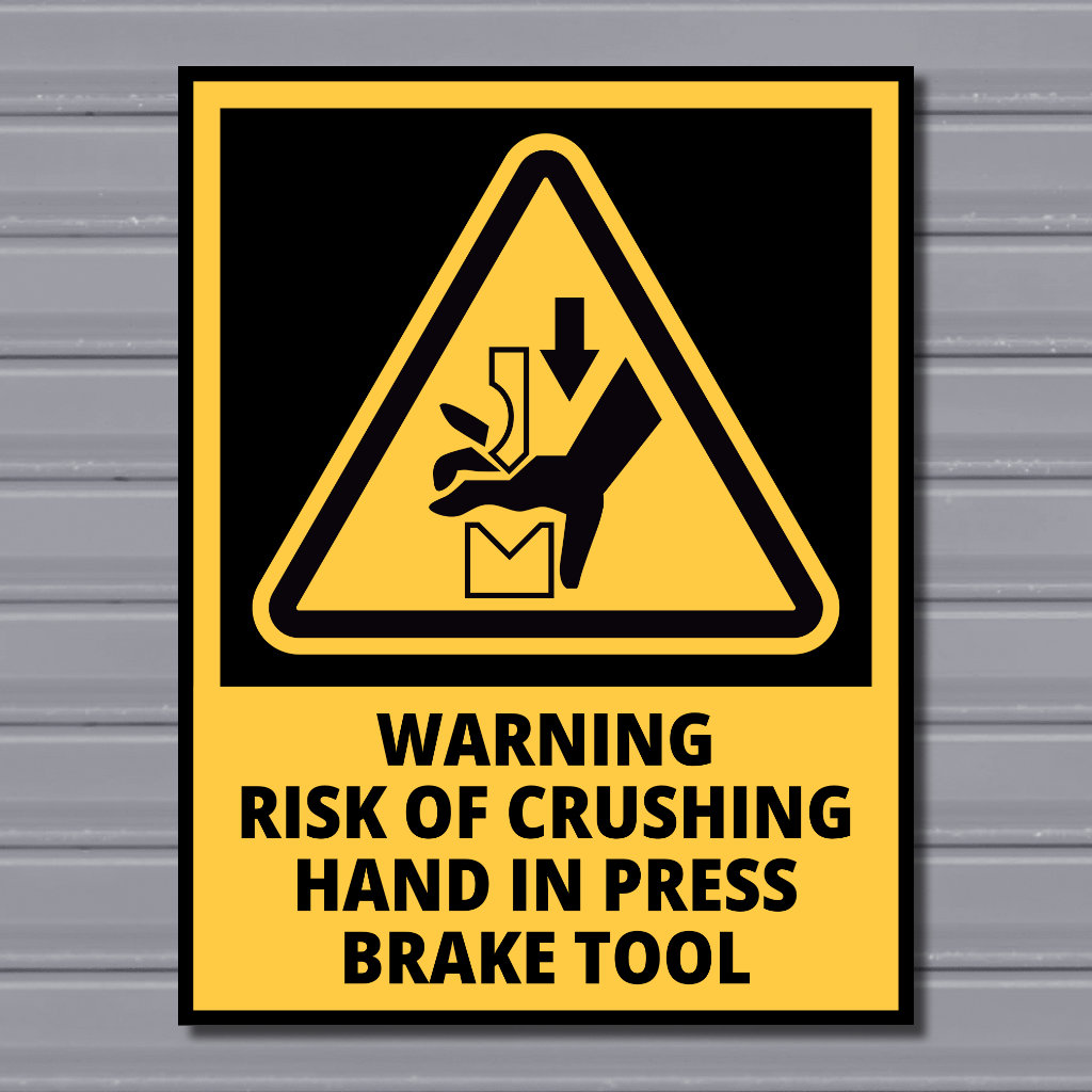 Installing this press brake tool hand crushing hazard warning sign ensures that operators, technicians, and nearby personnel are immediately aware of pinch point and crushing risks. Whether positioned near tooling zones, control panels, or machine access points, it plays a critical role in accident prevention, hazard awareness, and maintaining a professional, safety-focused workplace.