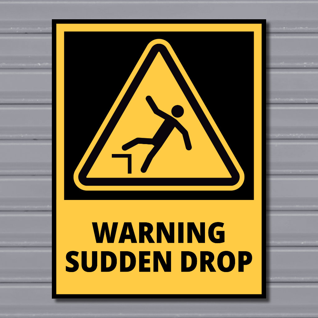 This portrait hazard safety sign measures 23x30cm and clearly warns of a sudden drop that may present a serious fall risk. Featuring a high-visibility warning symbol and bold text, it provides an immediate visual alert in areas where unexpected changes in floor level or edges may cause injury.