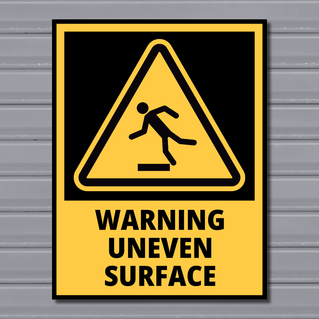 This portrait hazard safety sign measures 23x30cm and clearly warns of uneven surface conditions that may cause trips, slips, or loss of balance. Featuring a high-visibility warning symbol and bold text, it provides an immediate visual alert in areas where floor levels are irregular or unstable.